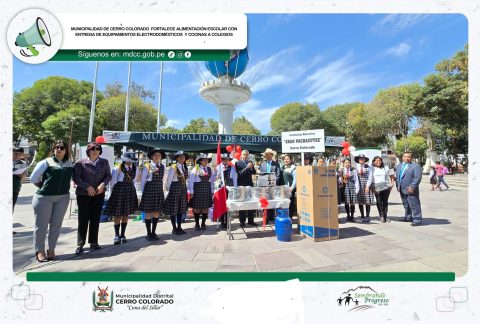 En un esfuerzo por mejorar las condiciones de alimentación de los estudiantes del nivel secundario, la Municipalidad Distrital de Cerro Colorado realizó la entrega de electrodomesticos, cocinas, ollas y licuadoras, a siete instituciones educativas, beneficiando a más de 2200 escolares como parte del fortalecimiento del Programa Nacional de Alimentación Escolar Wasi Mikuna.