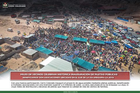 Con una multitudinaria participación de vecinos de diversas asociaciones de vivienda, este domingo 26 de abril se vivió una jornada histórica con la inauguración del proyecto “Creación del servicio de agua potable urbano a través de piletas públicas”, ejecutado por la Municipalidad de Cerro Colorado, una obra largamente esperada que hoy se convierte en realidad para cientos de familias.
