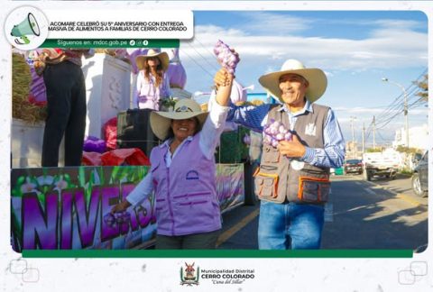 Con motivo de su quinto aniversario, el Mercado Mayorista ACOMARE desarrolló una significativa acción solidaria, llevando alimentos y productos de primera necesidad a diversas zonas de Cerro Colorado, en coordinación con la Municipalidad Distrital de Cerro Colorado, y con la participación activa del alcalde Econ. Manuel Enrique Vera Paredes.