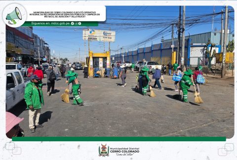 La Municipalidad Distrital de Cerro Colorado, a través de un trabajo articulado entre la Subgerencia de Licencias, Autorizaciones e ITSE; Subgerencia de Centro de Abastos y Camales; Gerencia de Seguridad Ciudadana; Subgerencia de Gestión del Riesgo de Desastres; Subgerencia de Gestión Integral de Residuos Sólidos; y Subgerencia de MantenimientodeInfraestructurayVías, desarrolló un operativo integral de recuperación de espacios públicos y limpieza general que abarcó parte de la Av. Aviación, los interiores de la plataforma comercial de Río Seco y la urbanización Villa Faucet.