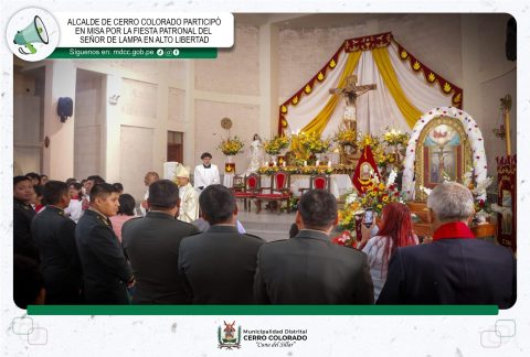 El alcalde de la Municipalidad Distrital de Cerro Colorado, Econ. Manuel Enrique Vera Paredes, participó este domingo de la misa solemne en honor al Señor de Lampa, patrono del sector Alto Libertad, como parte de las celebraciones por su tradicional Fiesta Patronal.