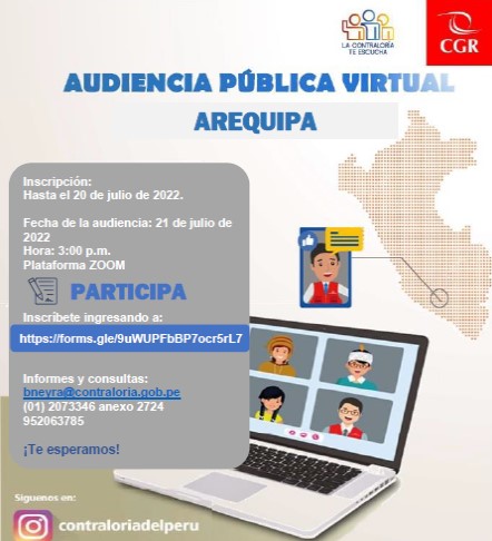 Audiencia Pública Virtual de la provincia de Arequipa que se realizará el 21 de julio del presente año a las 3:00 p.m. mediante la plataforma Zoom, las inscripciones son en el siguiente link hasta el 20 de julio: