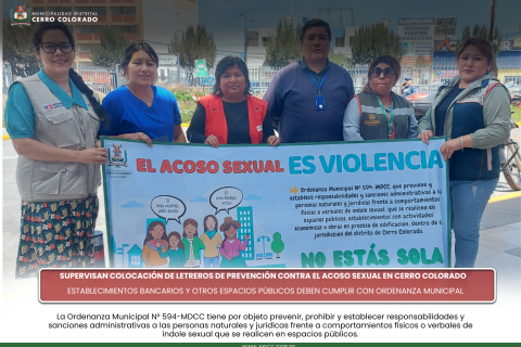 A fin de prevenir y sancionar comportamientos indebidos de índole sexual, la Gerencia de Desarrollo Social y la Subgerencia de Licencias, Autorizaciones e ITSE de la Municipalidad de Cerro Colorado, realizó una importante supervisión a diferentes establecimientos bancarios, con la finalidad de verificar el cumplimiento de la colocación de letreros donde se indique la Ordenanza Municipal N° 594-MDCC.