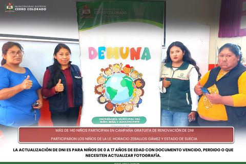 Con la participación de más de 140 niños se cumplió de forma oportuna la jornada de documentación itinerante para tramitar DNI, dicha actividad se realizó gracias a la gestión realizada por la Gerencia de Desarrollo Social de la comuna distrital de Cerro Colorado con la RENIEC, la cual se realizó de manera gratuita para niños de 0 a 17 años de edad con documento vencido, perdido o que necesiten actualizar fotografía.