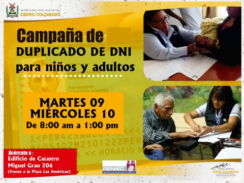 La Municipalidad Distrital de Cerro Colorado en coordinación con RENIEC realizaran una gran campaña de duplicados de DNI para adultos y niños, este martes 9 y miércoles 10 de noviembre, los interesados deben traer su fotografía tamaño pasaporte y el voucher de pago del derecho de duplicado.