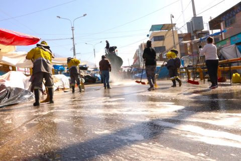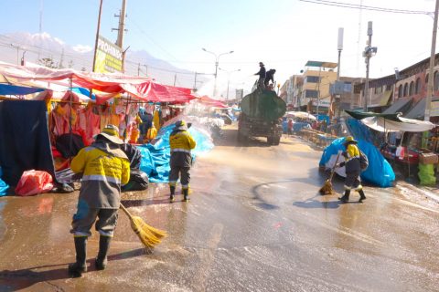 “Hemos trasladado un volquete, un cargador frontal para recoger 12 toneladas de basura en general, y juntamente con un equipo de trabajadores municipales con la participación de los mismos comerciantes, se ha baldeado de la avenida Emancipación, con el apoyo del cisterna municipal, luego de ello, se ha realizado la sanitización correspondiente” indicó Marco Loayza, Administrador municipal del emporio comercial.