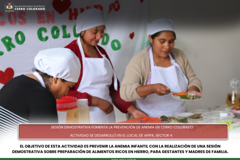 Con el objetivo de prevenir la anemia infantil, la Gerencia de Desarrollo Social del distrito de Cerro Colorado realizó una sesión demostrativa sobre preparación de alimentos ricos en hierro, dirigida a madres de familia y gestantes.