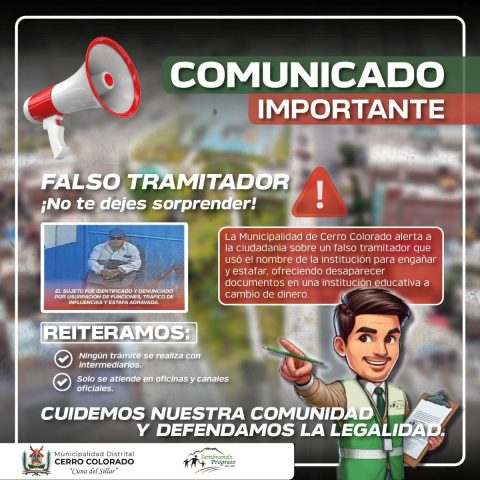 La Municipalidad de Cerro Colorado informa que se ha identificado a una persona que, de manera fraudulenta, venía utilizando el nombre de nuestra institución para engañar a la población y afectar la imagen de esta entidad pública.