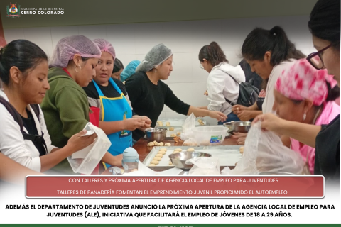 Con la finalidad de fomentar el emprendimiento en los jóvenes y tener un empleo para su bienestar, la Municipalidad Distrital de Cerro Colorado, a través de su Departamento de Juventudes, desarrolla talleres de panadería y pastelería dirigidos a jóvenes, con el objetivo de fortalecer el emprendimiento y mejorar sus oportunidades de empleo.